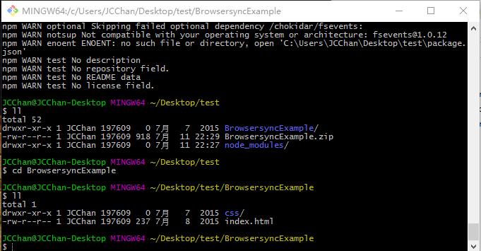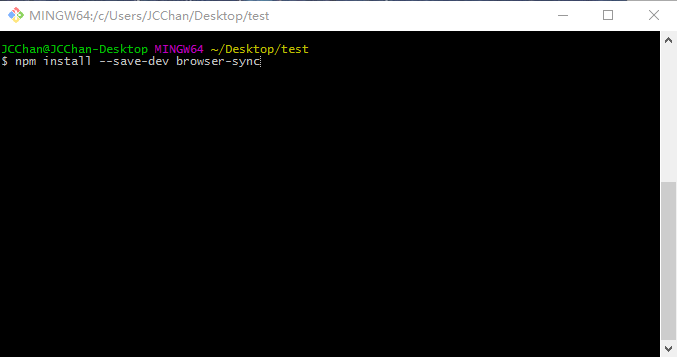 - 在某个英文目录下建立起一个文件夹,作为放置待响应式测试的站点的根目录,注意这里的路径都不能有中文,由于是测试,我直接在桌面上建立一个test文件夹,进来以后运行命令。